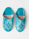 Moroccan Leather Babouche Sequin Slippers in Aqua, a vibrant pair of bespoke slippers in aqua blue leather. Handmade using the...