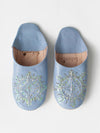 Moroccan Leather Babouche Sequin Slippers in Ice Blue, a pastel pair of bespoke slippers embroidered with blue sequins....