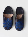Moroccan Leather Babouche Sequin Slippers in Black & Cobalt, a vibrant pair of bespoke slippers in black leather. Handmade using...