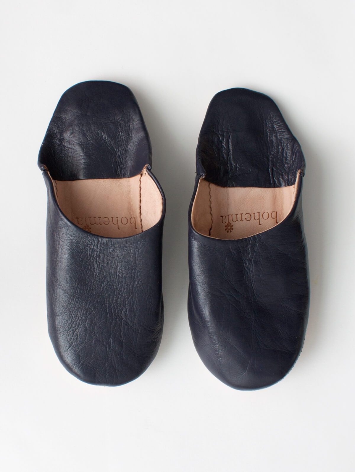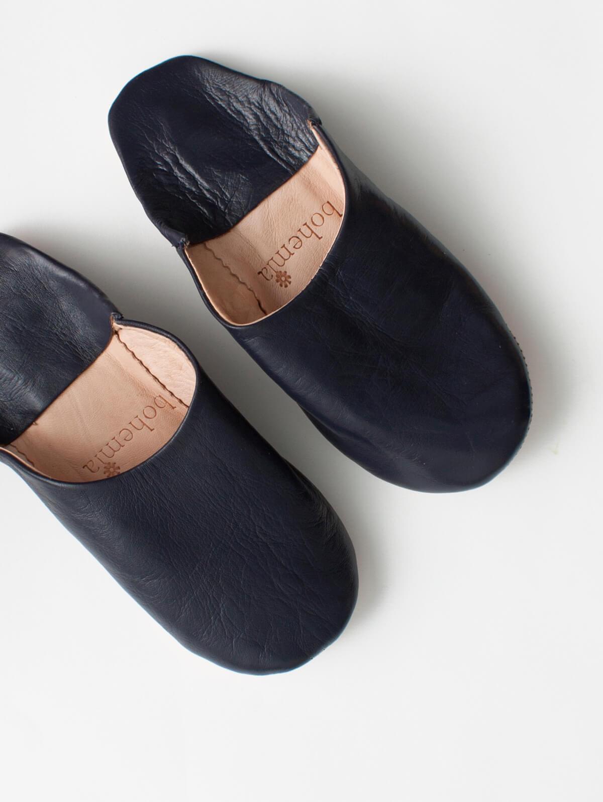 Moroccan Leather Babouche Basic Slippers in Indigo, a contemporary pair of bespoke slippers in soft indigo blue leather. Handmade using the traditional techniques of our skilled leather artisans, Hamid and his team have been making slippers for Bohemia for more than 15 years in their Moroccan workshop. Our classic leather slippers are the ultimate home accessory and the perfect gift, with free gift wrapping available at the checkout.