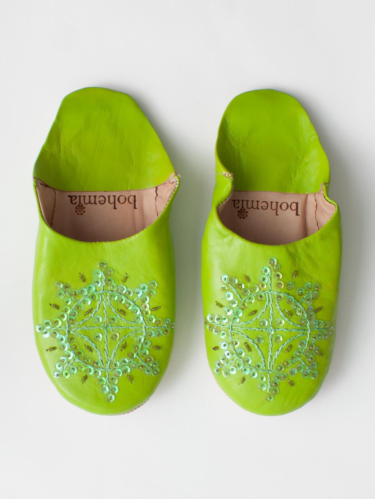 Moroccan Babouche Sequin Slippers, Lime - Bohemia Design
